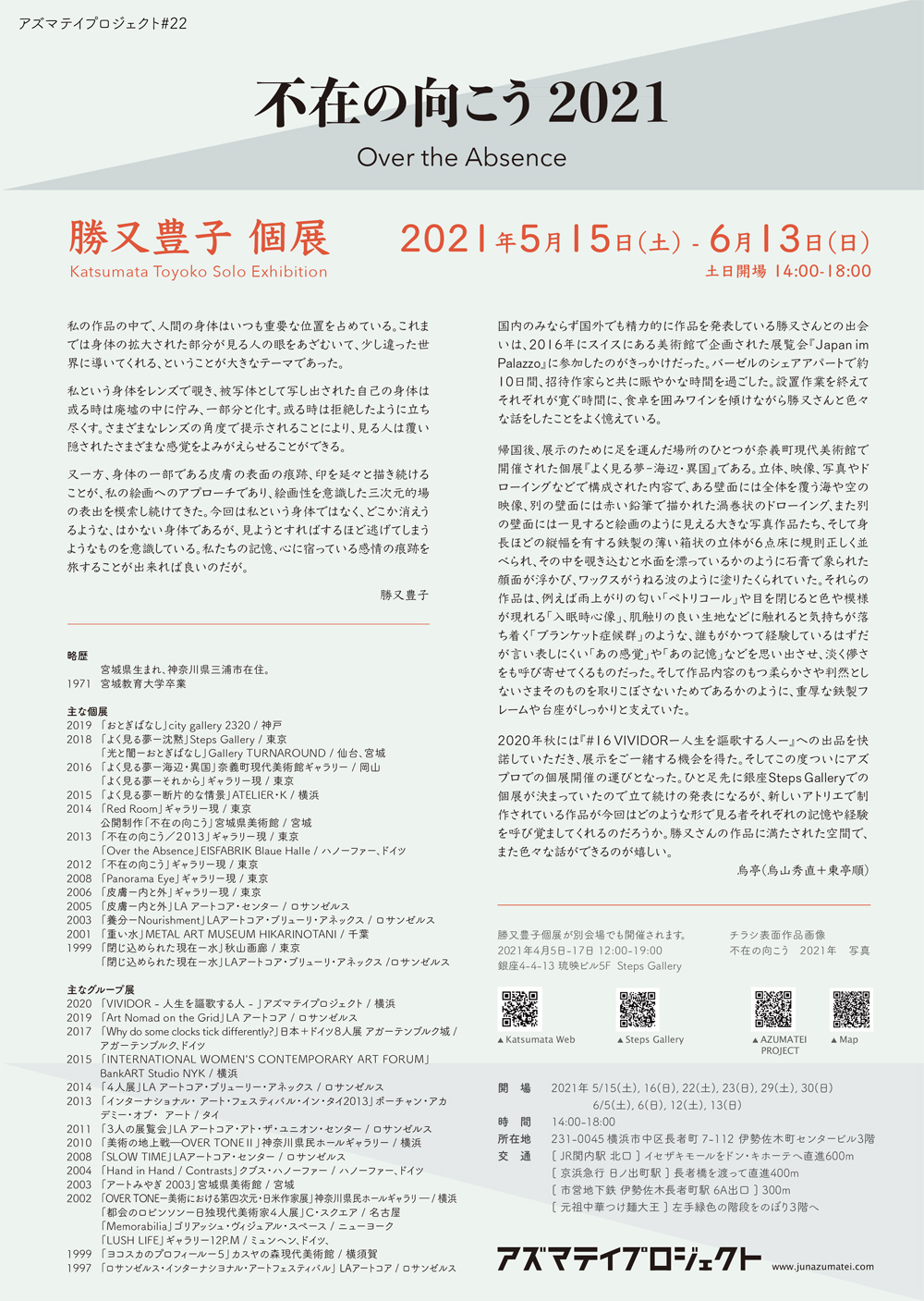 勝又豊子 展 Toyoko Katsumata Solo Exhibition - 不在の向こう Over the Absence 2021 - 2021年5月15日 ー 6月13日 会場:アズマテイプロジェクト 横浜市中区長者町7-112 伊勢佐木町センタービル3階 https://g.page/AZUPRO?share HP: www.junazumatei.com
